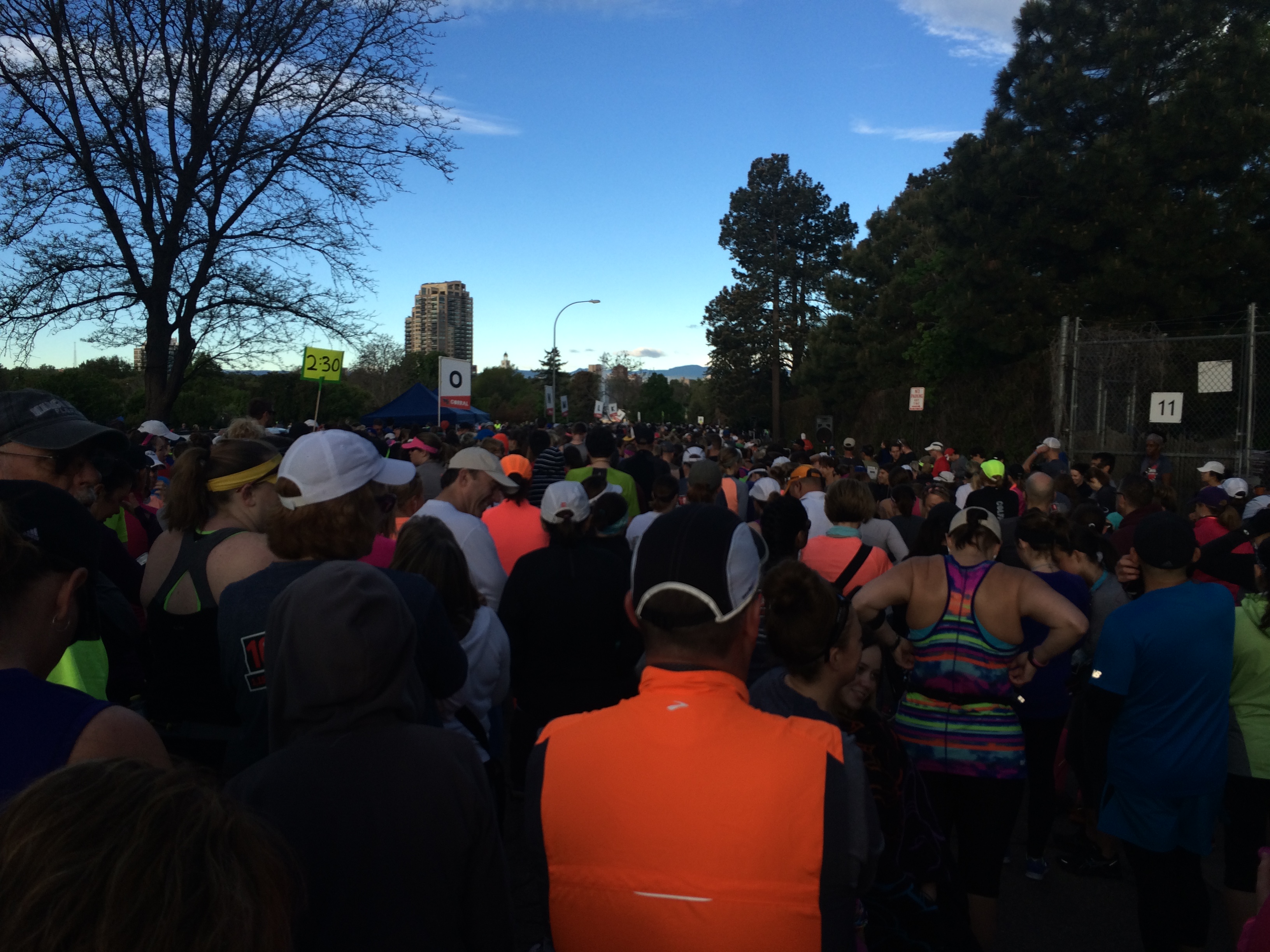 I got a good night of sleep before the Colfax Half Marathon. I wanted to be at my best for the race. I woke up at 4am so I could prepare and find a parking space before 5:30am. Parking was a challenge and after driving around for nearly 20 minutes I finally found a very tight spot on the street. I parked and walked to the start. It was quite a walk actually, I was completely on the other side of City Park. I got to the starting line just as the full marathon was starting, which was 6am. It was really cool to see it start.