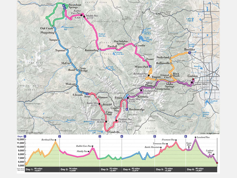 Day 1: Boulder to Winter Park, 89 Miles, 9,911’ Elevation Gain. Day 2: Winter Park to Steamboat Springs, 95 Miles, 4,213’ Elevation Gain. Day 3: Steamboat Springs Loop “Twenty Mile Rd.”, 54 Miles, 3,831’ Elevation Gain. Day 4: Steamboat Springs to Avon, 82 Miles, 5,139’ Elevation Gain. Day 5: Avon to Breckenridge, 74 Miles, 5,580’ Elevation Gain. Day 6: Breckenridge to Golden, 77 Miles, 4,821’ Elevation Gain