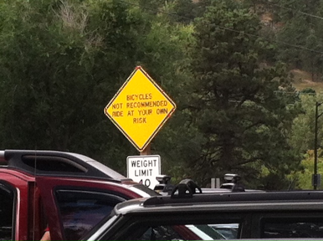 When I see signs like this, I ask myself, “Is it worth it?” And before I can answer in my head, I’m already pedaling past the sign. Sunday, Jared and I rode up Boulder Canyon. And when I say ride, I really mean “struggle.” We struggled hard up that canyon. We were determined to bike through, but unfortunately, the weather took a turn for the worse: the wind picked up and it started to sprinkle. We once rode through Golden Gate Canyon through rain and it was awful. Absolutely awful. We wanted to keep a positive experience of Boulder Canyon, so we turned around. If it weren’t for the cars, the descent would have been fabulous. Unfortunately, with the cars buzzing by and the giant potholes that could have sucked both myself and my bike in, I couldn’t enjoy it as much as I wanted. I was too worried if I went too fast, I’d lose control and slam on to the ground. Then, of course, a truck would be passing at that exact moment and I’d be squashed like a pancake.