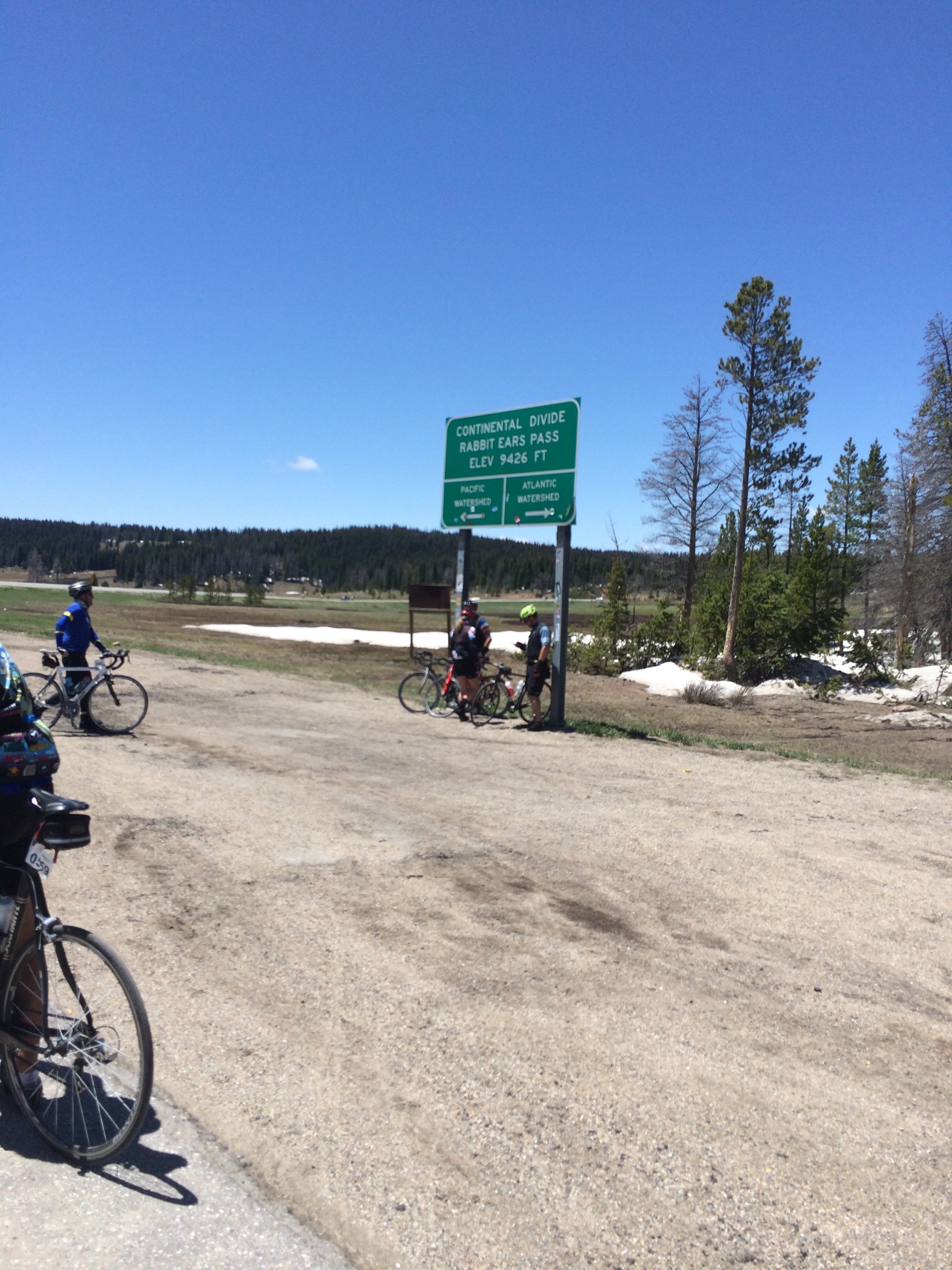 Most of the ride was uneventful, just pedaled away, some rolling hill fairly easy all in all. Then we got to the pass. Rabbit Ears, I’ve driven it, didn’t think much of it in the car, but riding it, that’s another story. I have to admit I loved the climb, not too steep, very steady and a good challenge. I didn’t realize that Rabbit Ears wasn’t over once you got to the continental divide. There were several miles at the summit with a east and west side. It was cold up there, and I was excited to get down.